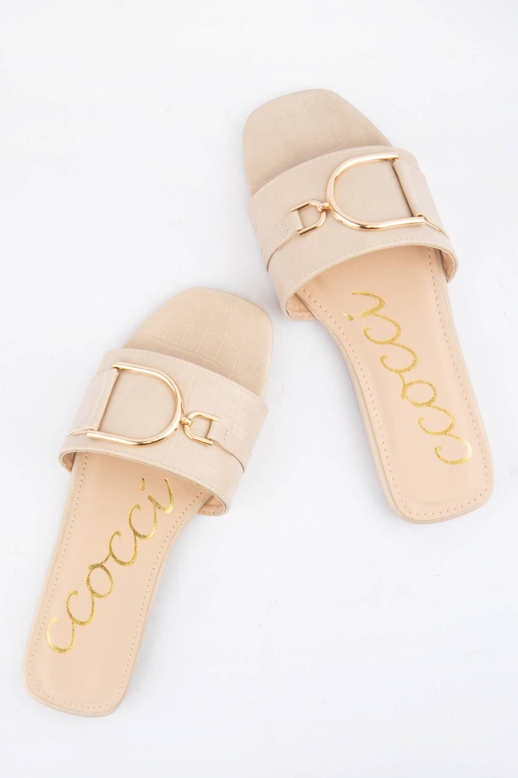 GOLDEN D-RING STRAP SLIP-ON SANDALS: BEIGE